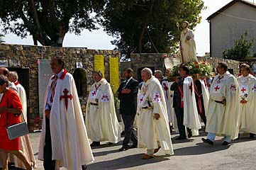 (en costume sombre) et la statue de leur saint-patron.